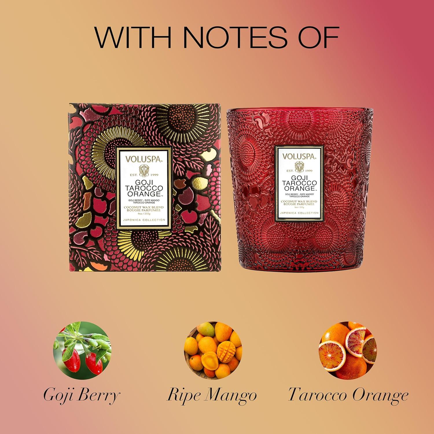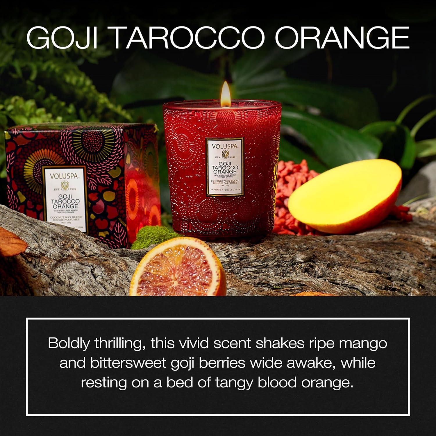 - Discover the latest Voluspa Goji Tarocco Orange, Classic Boxed Candle, 9 oz, 60 Hour Burn Time, Coconut Wax for Clean Burning, Handcrafted in The USA(White Cypress) from and take advantage of our limited-time introductory offer.