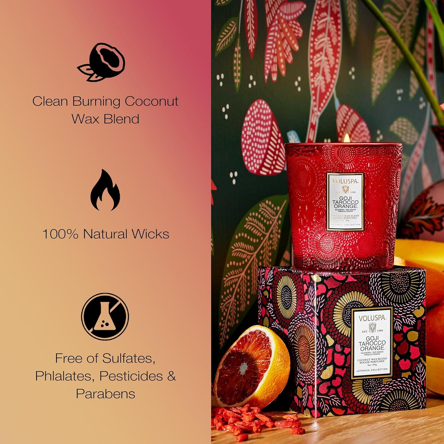- Our clearance section features the best deals on Voluspa Goji Tarocco Orange, Classic Boxed Candle, 9 oz, 60 Hour Burn Time, Coconut Wax for Clean Burning, Handcrafted in The USA(Mokara) and accessories. Check it out now!