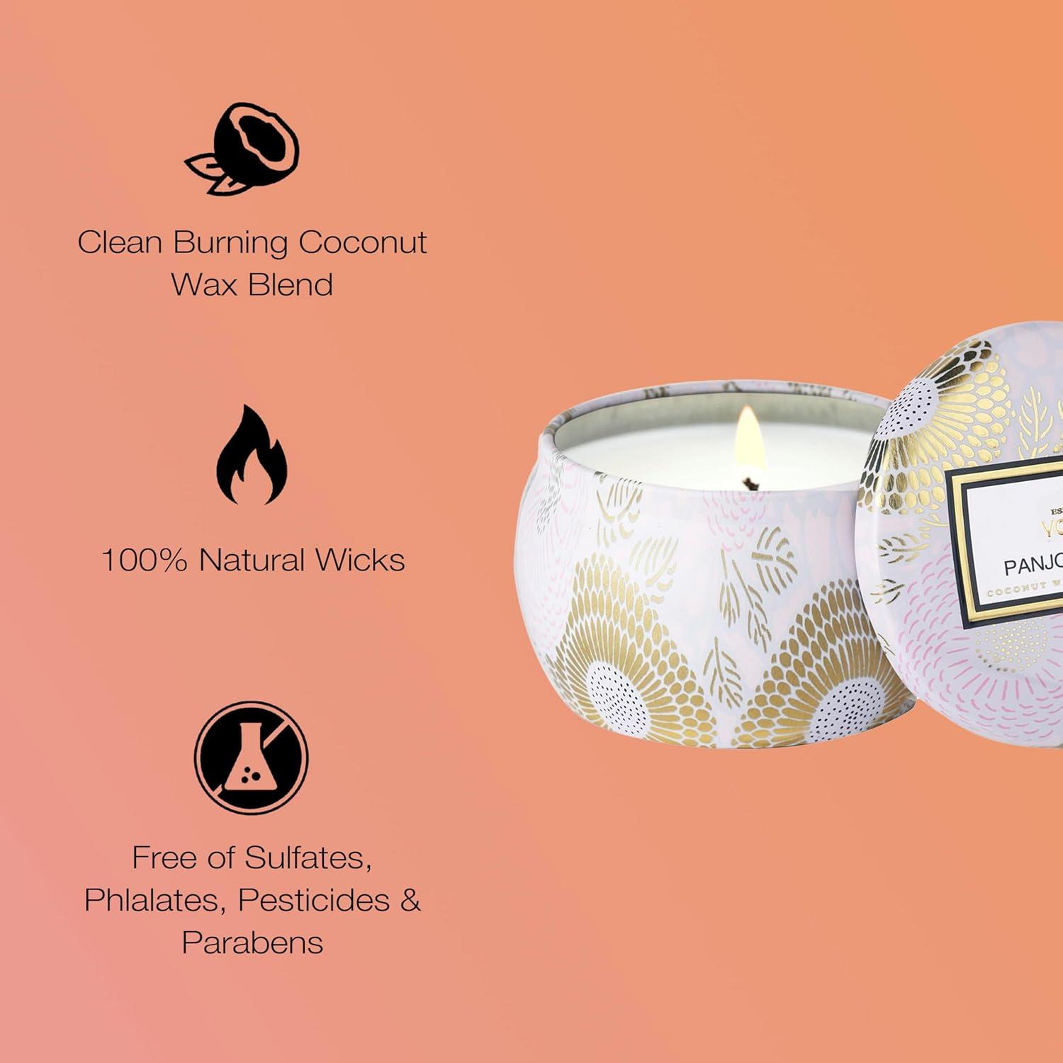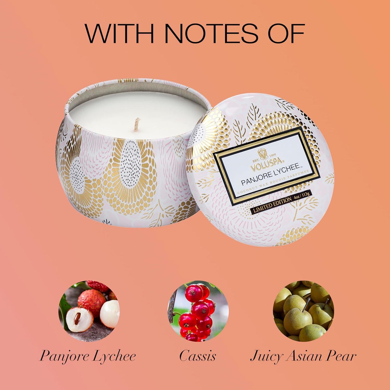 • Voluspa French Cade Lavender, Mini Tin Candle, 4 oz, 25 Hour Burn Time, Coconut Wax for Clean Burning, Handcrafted in The USA(Panjore Lychee)