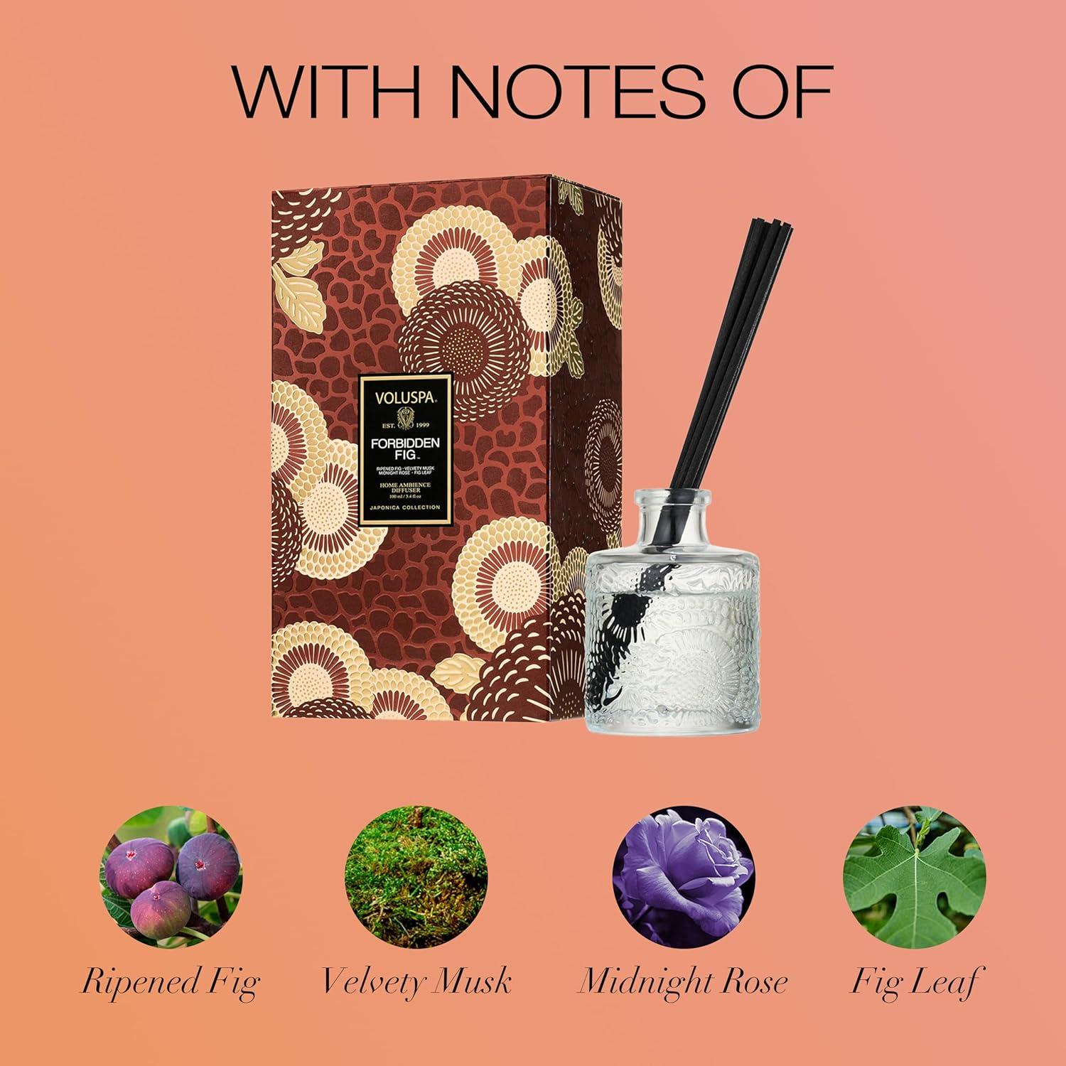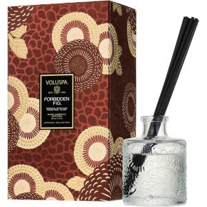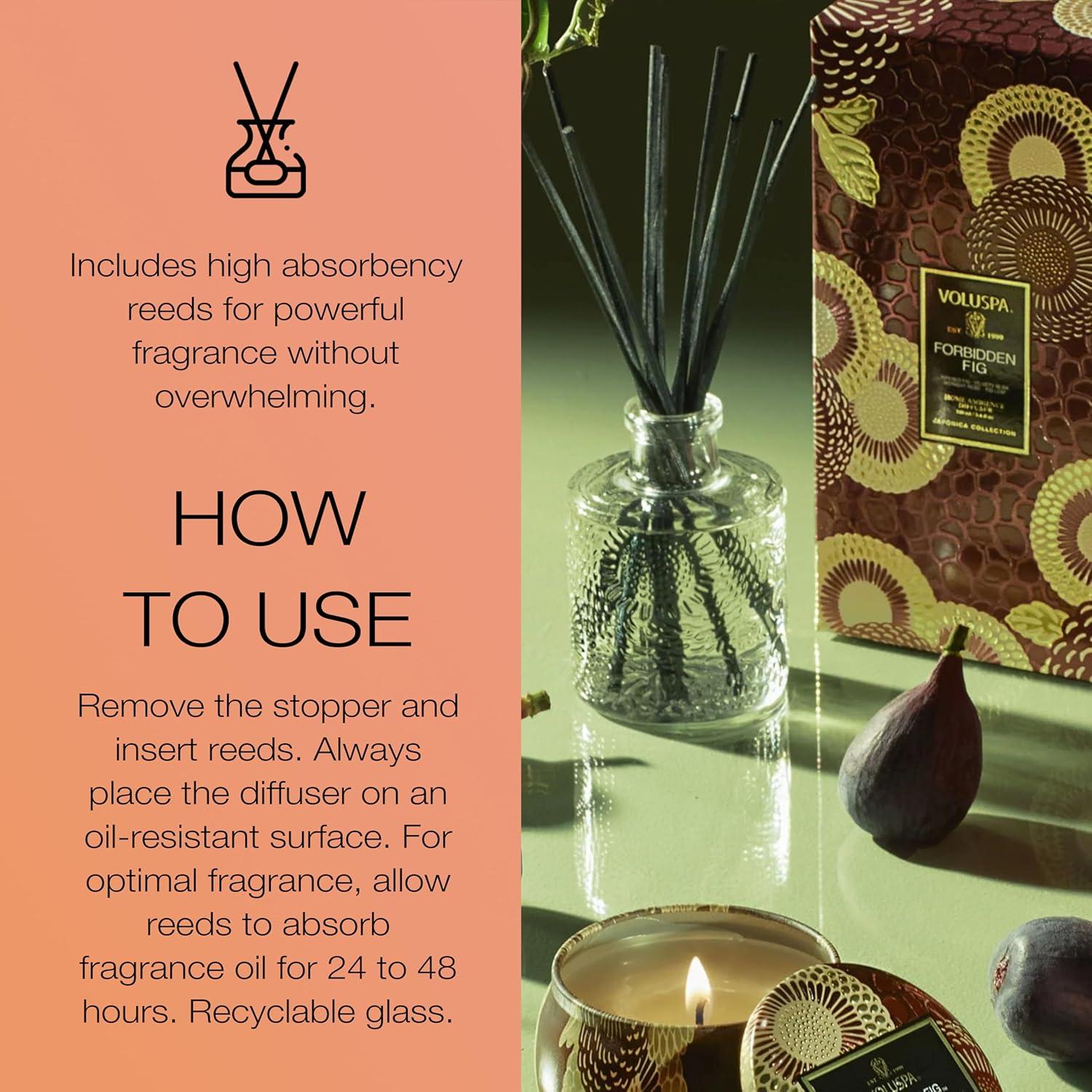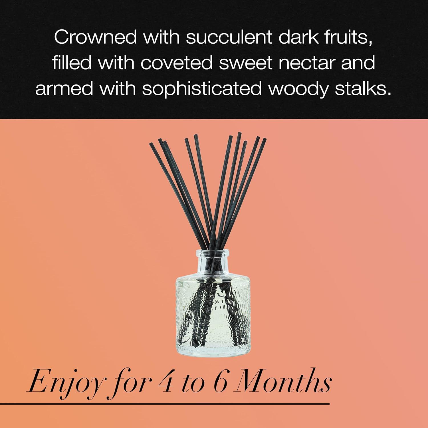 Notes of Solid Black Ebony Wood, Ripe Peaches & Apple Blossom. Fragrance Description Take in the deep sensual darkness of wood paired with fruit. Inhale the scent of solid Black Ebony and Mahogany with the succulence of ripe Peaches and Apple Blossom. Like discovering an overflowing fruit orchard in the deepest, darkest enchanted forest – imagine this irreverent scent combination, so appealing in its darkly, unexpected, juicy delight. A Voluspa classic, feel free to pick it. About the Product Voluspa’s fragrant diffuser oil is hand-poured into an glass vessel for a subtle pop of elegant décor. Create your home's signature, always-on fragrance in spaces requiring minimal effort, and enjoy for 4-6 months. Includes 10 rattan reeds for powerful fragrance without overwhelming.