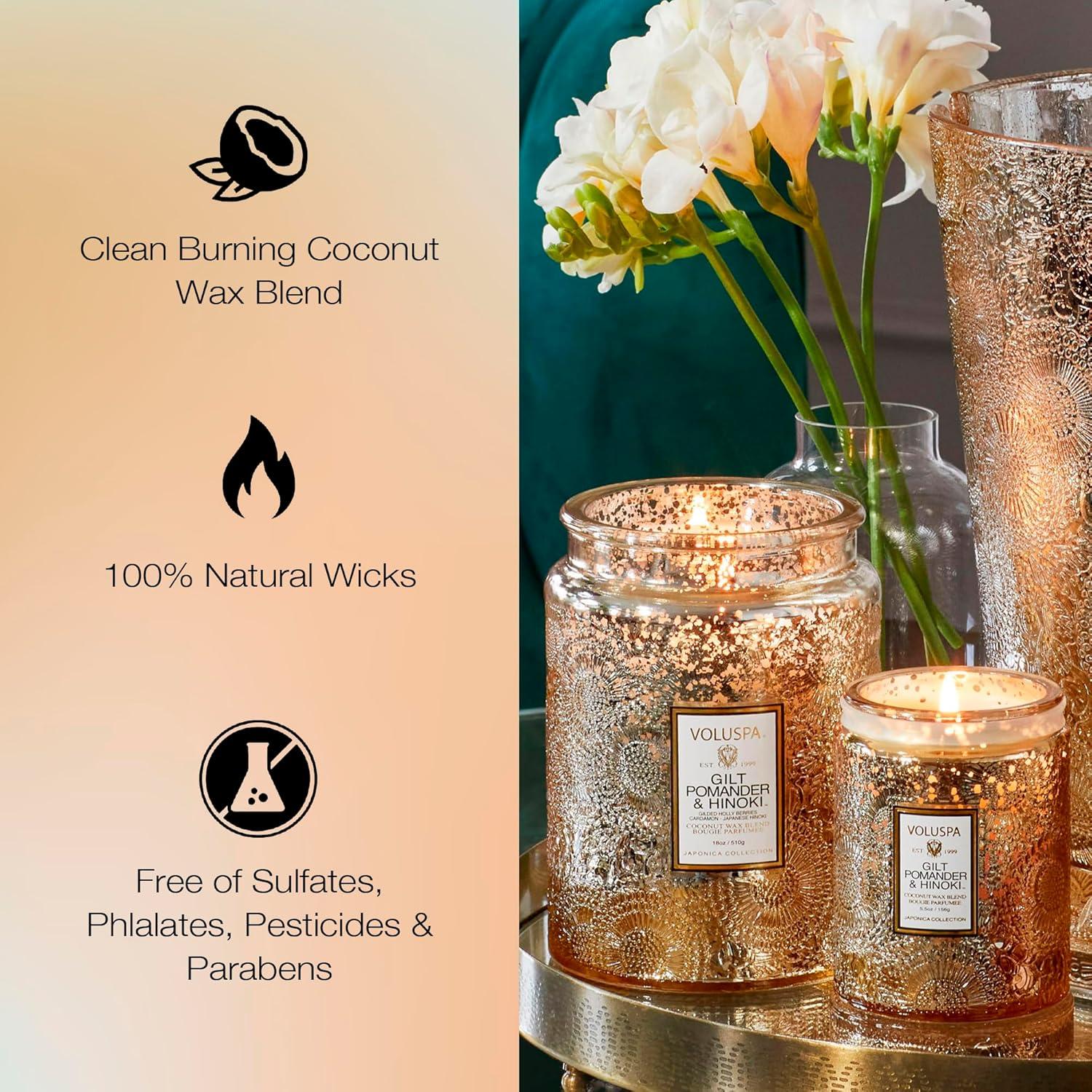 Voluspa Cherry Gloss, Rose Petals & Leather Scented Candle: These luxurious flower scented candles are infused with the refreshing essence of Smoked Cherry, Rose Petals, and a hint of leather evoking relaxation and rejuvenation. The natural wicks and coconut wax blend of our decorative coconut wax candles ensure a clean and even burn, while these 18 oz, clean smelling candles offer a 100-hour burn time, allowing you to enjoy the fragrance for longer. These cherry scented coconut candles are the perfect addition to any room in your home, whether it be the bedroom, bathroom, kitchen, or living room. Crafted with a rich blend of ingredients, these citrus candles for home provide an even burn accompanied by a calming fragrance. We take pride in being one of the first companies to use a coconut wax blend in our fruity scented candles. Our proprietary Coconut Wax Blend burns up to 90% cleaner than its pure soy wax counterpart, ensuring a long-lasting burn. The clean burning candles are free from harmful chemicals and are not tested on animals. The fragrant blend of this orange candle creates a citrusy and sweet scent that will transport you to a peaceful oasis, making these great smelling candles perfect for the spring and summer months. Our vegan candles gifts for women will fill your space with a fragrant aroma that will leave you feeling relaxed and rejuvenated. These unique scents add a touch of sophistication, making these candles an ideal gift for impressing guests or gifting to loved ones for anniversaries, birthdays, baby showers and more.